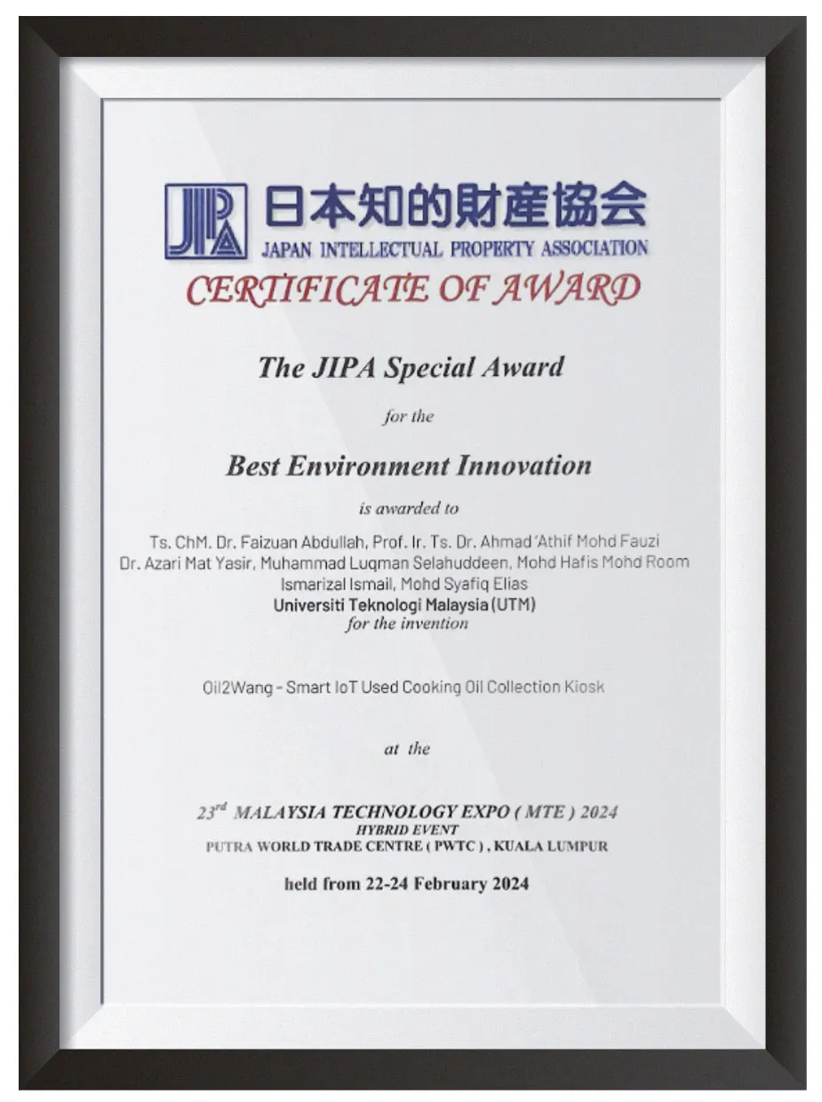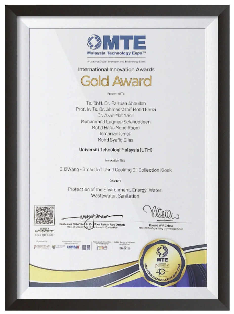Oil2Wang® system is an IoT system specifically designed for collection of used cooking oil in housing communities. Utilizing IoT, Oil2Wang® kiosk ease the burden of households to sell minimal amounts of used cooking oil and collectors can come collect large amounts at intervals.